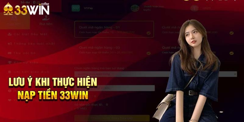 Khi nạp tiền vào tài khoản nhà cái 33win, mọi người cần lưu ý một số vấn đề sau đây để giao dịch được thực hiện thành công.