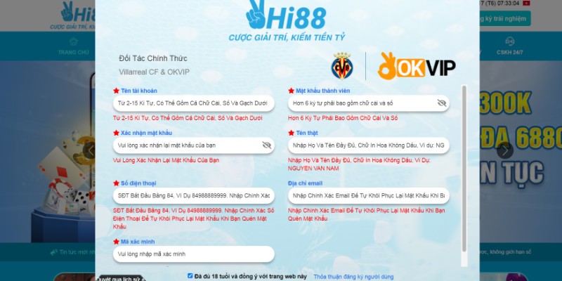 • Để mở tài khoản, bạn cần sẵn sàng và tự nguyện cung cấp thông tin cá nhân chính xác. Điều này bao gồm các thông tin như họ tên, địa chỉ, số điện thoại, và các thông tin khác theo yêu cầu của Hi 88.