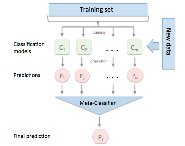 Có nghĩa Meta-model được huấn luyện dựa trên đầu ra dự đoán của các base-modes, các outputs này kết hợp với nhãn của bài toán tạo thành cặp dữ liệu đầu vào – đầu ra trong quá trình huấn luyện Meta-model. Có thể thấy Meta-model không học trực tiếp từ tập dữ liệu huấn luyện, tuy nhiên, việc dùng dữ liệu bàn đầu thêm vào outputs của base-models vẫn hoàn toàn hợp lý, sẽ cấp thêm cho meta-model nhiều thông tin hơn về dữ liệu.