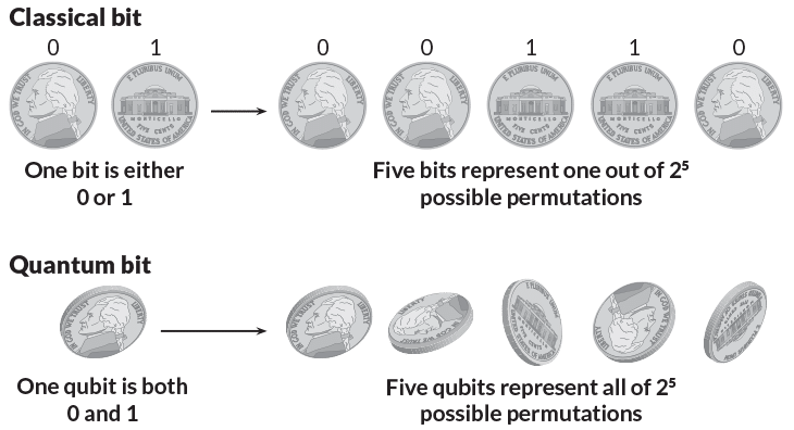 Khác với máy tính kỹ thuật số dựa trên tranzitor đòi hỏi cần phải mã hóa dữ liệu thành các chữ số nhị phân, mỗi số được gán cho 1 trong 2 trạng thái nhất định là 0 hoặc 1, tính toán lượng tử sử dụng các bit lượng tử ở trong trạng thái chồng chập để tính toán. Điều này có nghĩa là 1 bit lượng tử có thể có giá trị 0 và 1 ở cùng 1 thời điểm, tức là xảy ra hiện tường chồng chập lượng tử của qubit.