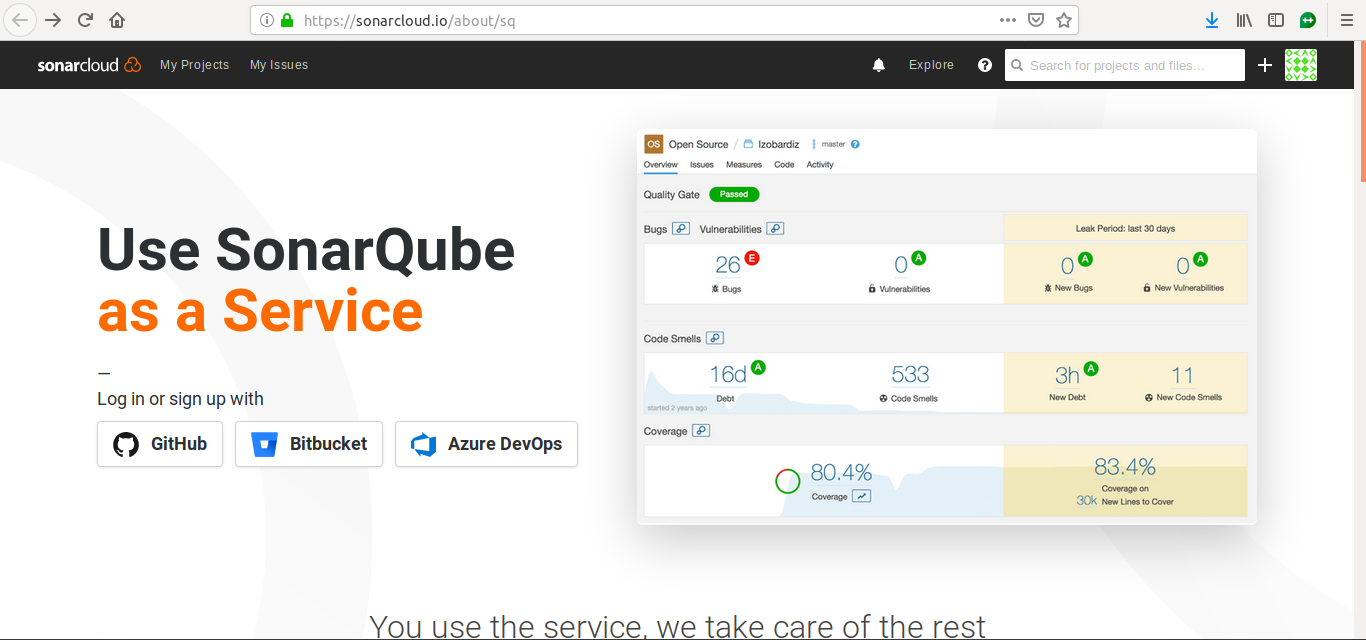 - Truy cập vào sonarcloud.io/about/sq , bạn có thể chọn đăng nhập với nơi lưu trữ project cần test của bạn (git hay bitbucket), ở đây mình sử dụng github là nơi lưu trữ project để test.