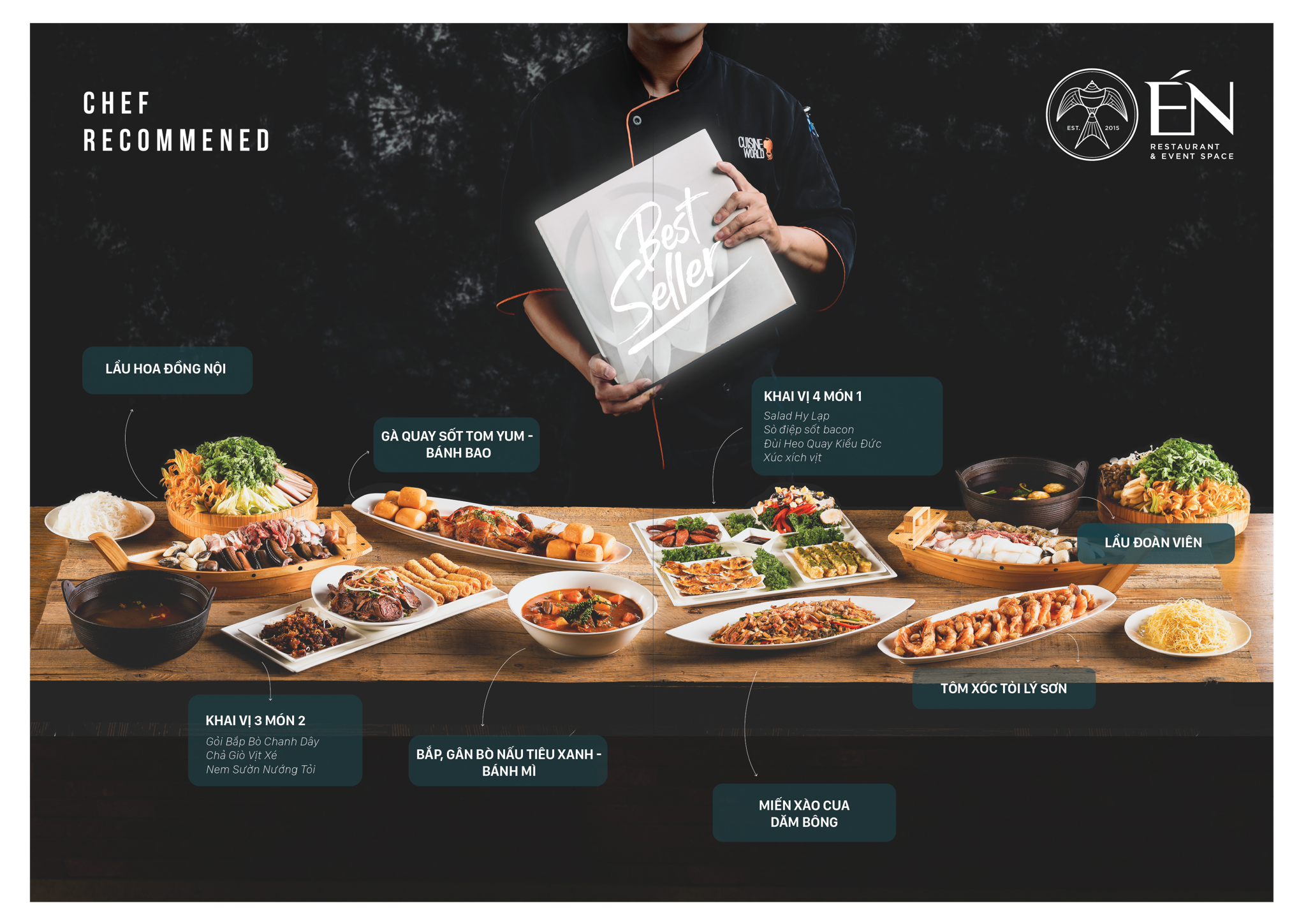 Bắt đúng xu hướng ẩm thực hiện nay, những món ăn tại Én Restaurant & Event Space là sự kết hợp hài hòa giữa ẩm thực Á – Âu, mang lại sự cân bằng trong vị giác và hợp ý người Việt. Không chỉ vậy, với những khách hàng nước ngoài, khách hàng có tôn giáo hay theo trường phái ăn uống đặc biệt, đầu bếp Én cũng đều có thể đáp ứng được yêu cầu và đảm bảo tổng thể thực đơn hài hoà, ngon miệng. Từng món ăn tại Én đều được đầu bếp lựa chọn nguyên liệu kỹ lưỡng, thận trọng trong khâu sơ chế và chuyên nghiệp trong quá trình nấu nướng, từ đó tạo nên những món ăn độc đáo và ấn tượng.