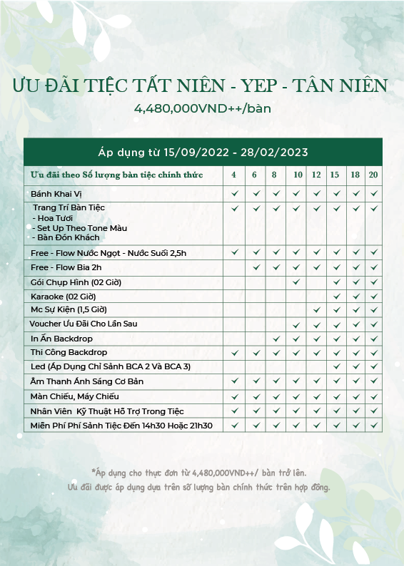 Với tiệc tân niên, Én Restaurant & Event Space gửi đến quý khách hàng những ưu đãi đặc biệt hấp dẫn nhất. Từ thực đơn hấp dẫn nhiều món ngon đến các gói dịch vụ hoàn toàn miễn phí theo bàn tiệc, hãy cùng tham khảo ngay!